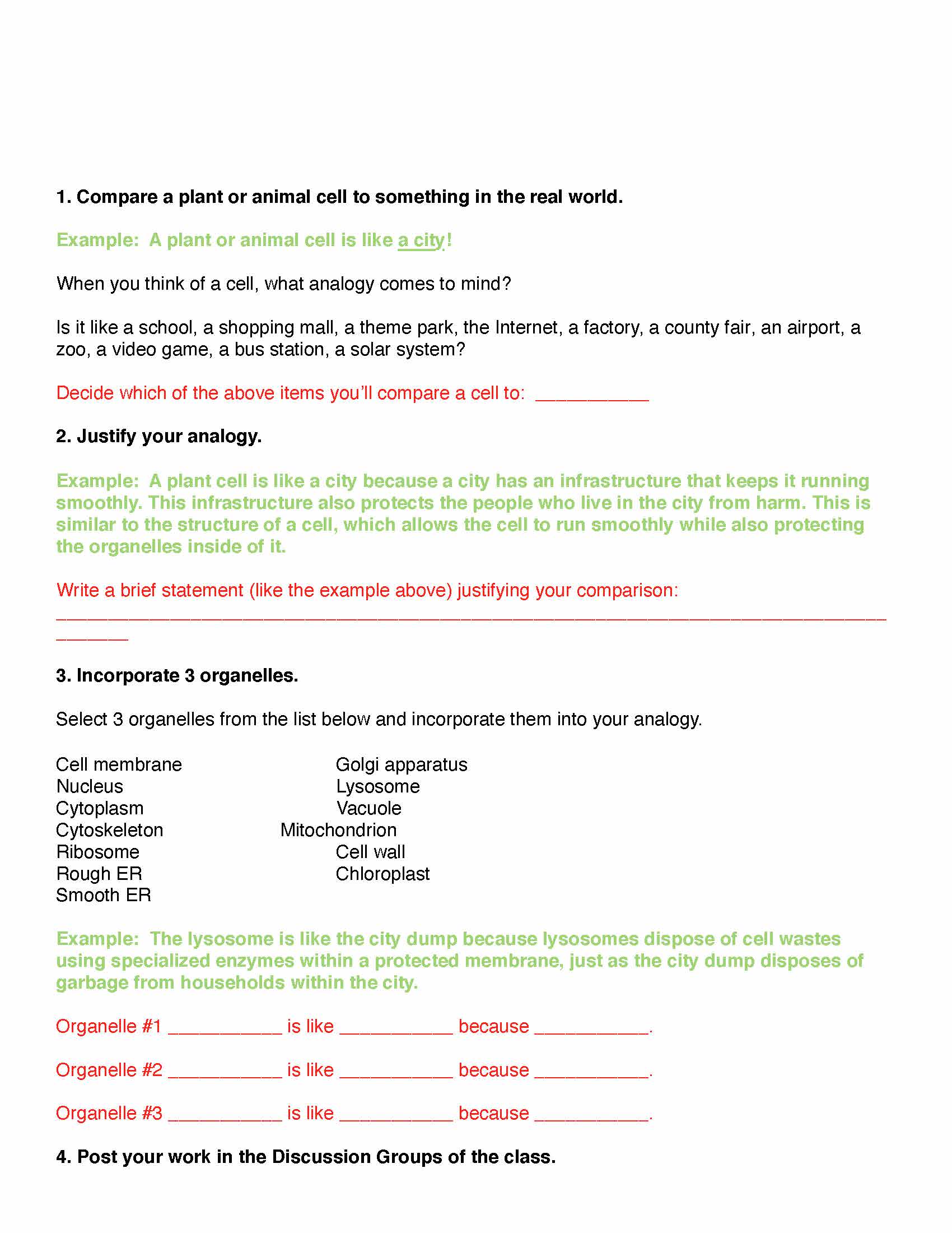 1. Compare a plant or animal cell to something in the real world. ...