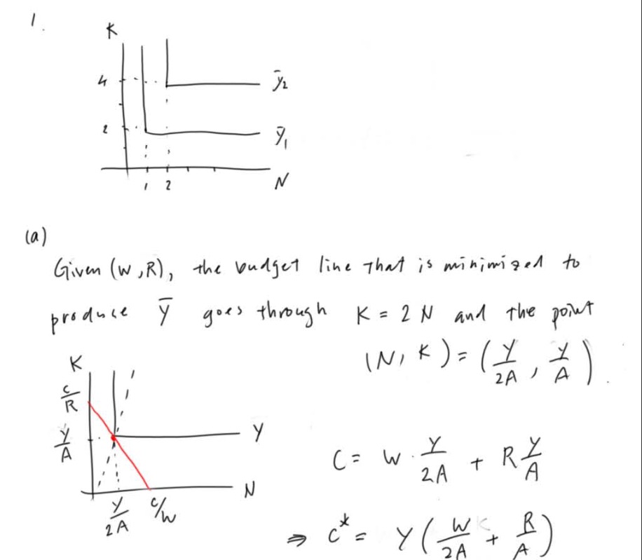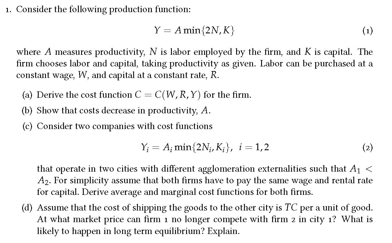 1. Consider the following production function: Y = Amin {2N,K} (1...