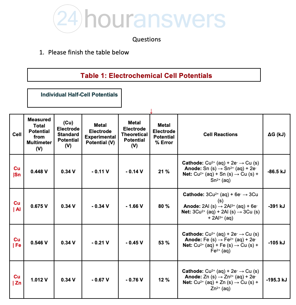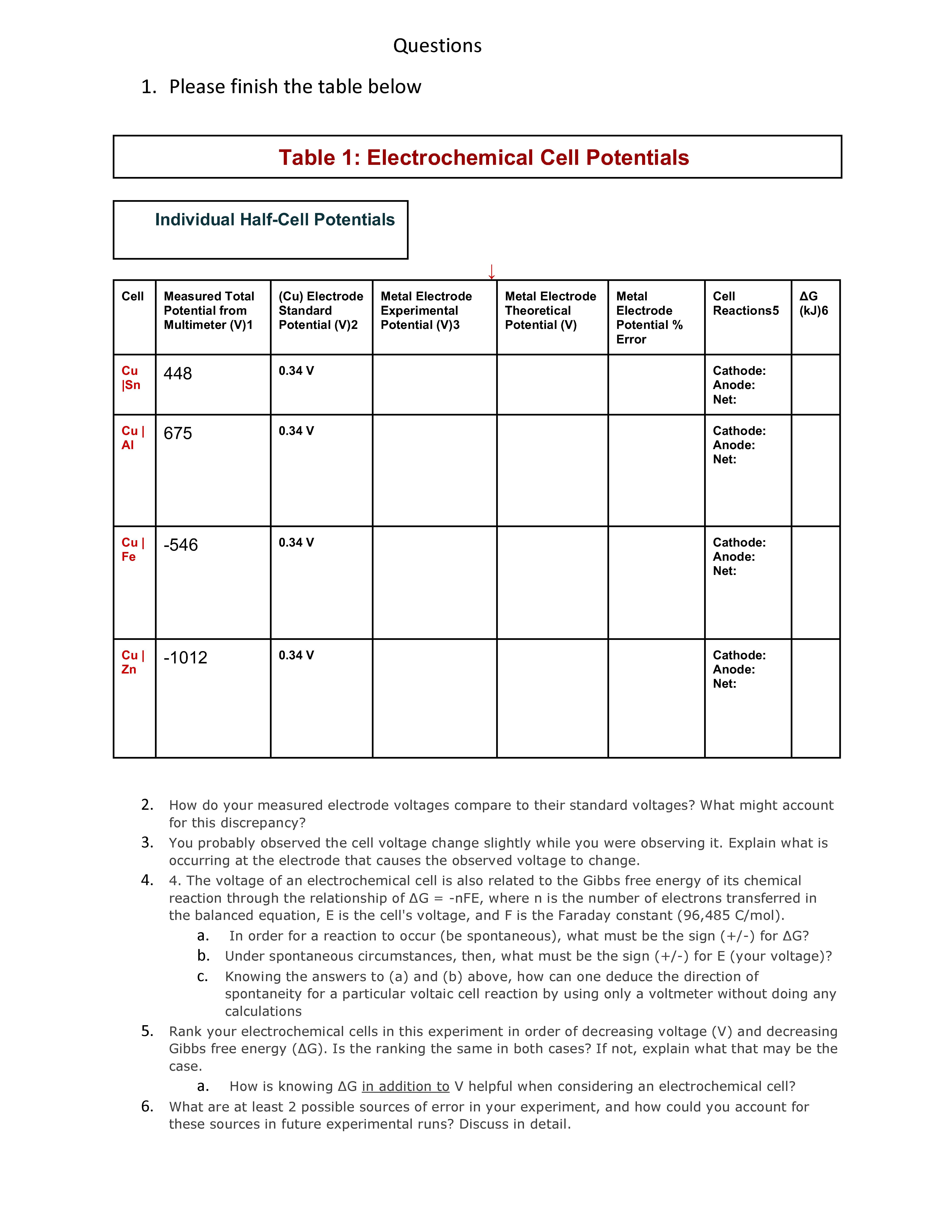 Questions 1. Please finish the table below Table 1: Electrochemic...