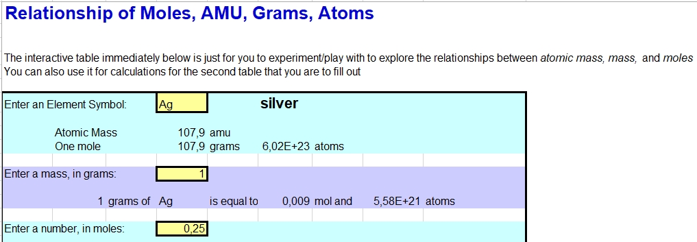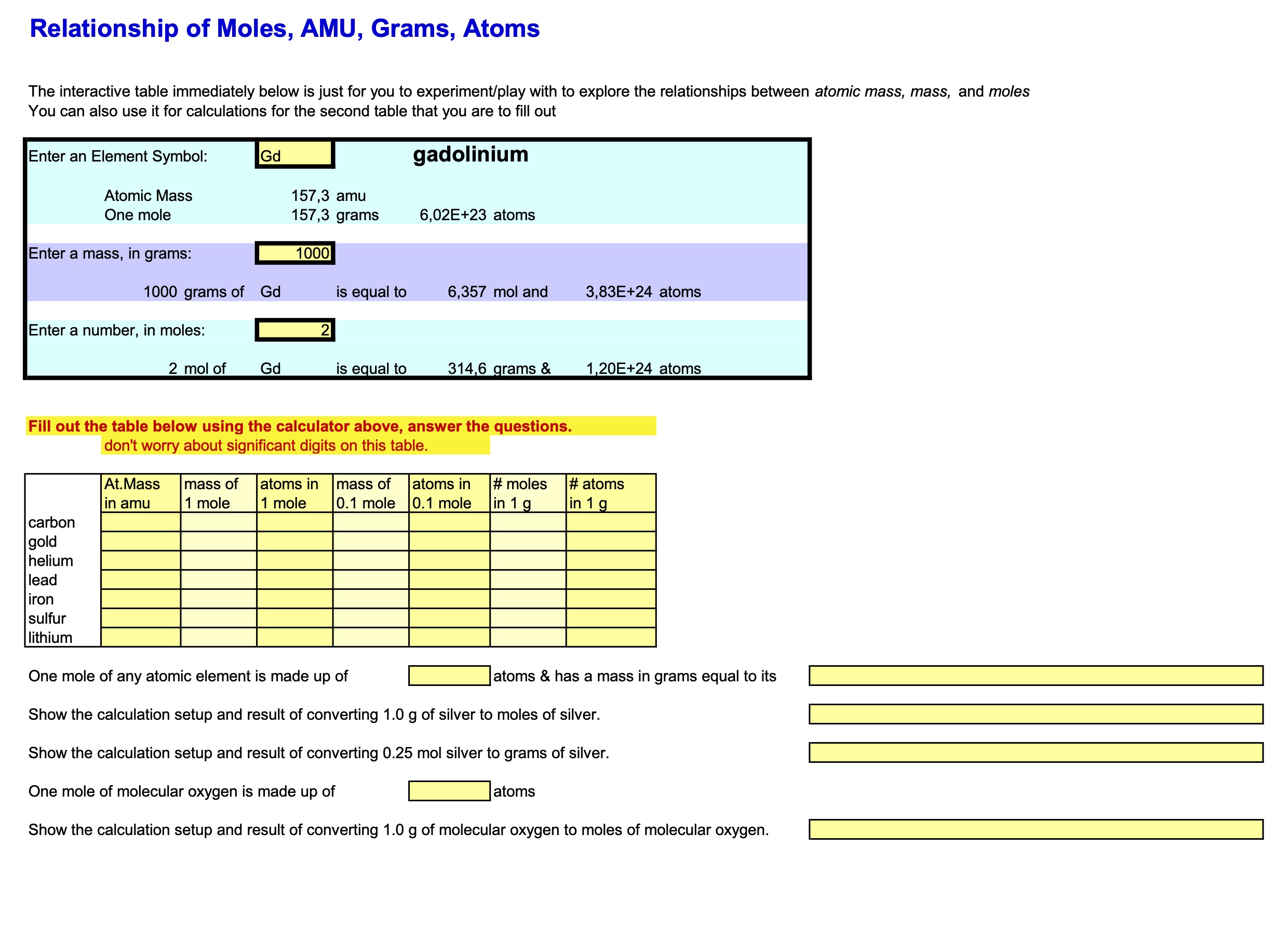 Relationship of Moles, AMU, Grams, Atoms The interactive table imm...