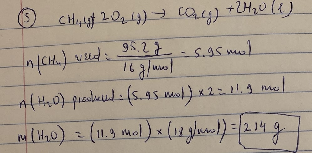 5. Calculate the mass of water produced by 95.2 grams of CH4. C...