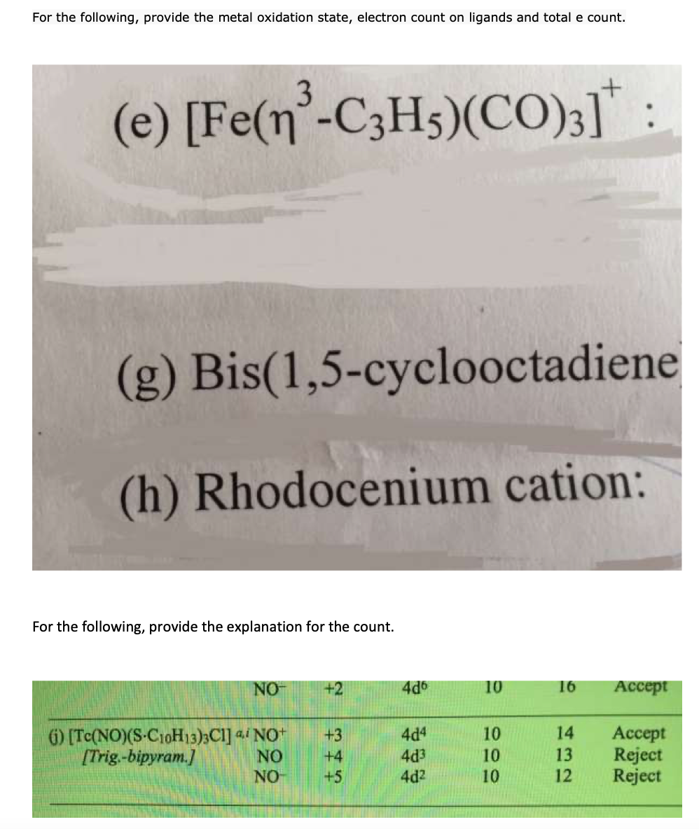 For the following, provide the metal oxidation state, electron coun...