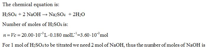 A 20.00 mL of 0.180 (M) H2SO4 solution was titrated to the equivale...