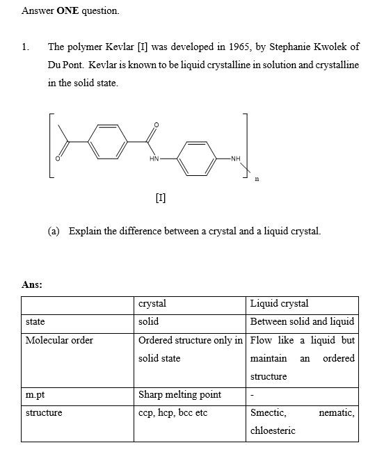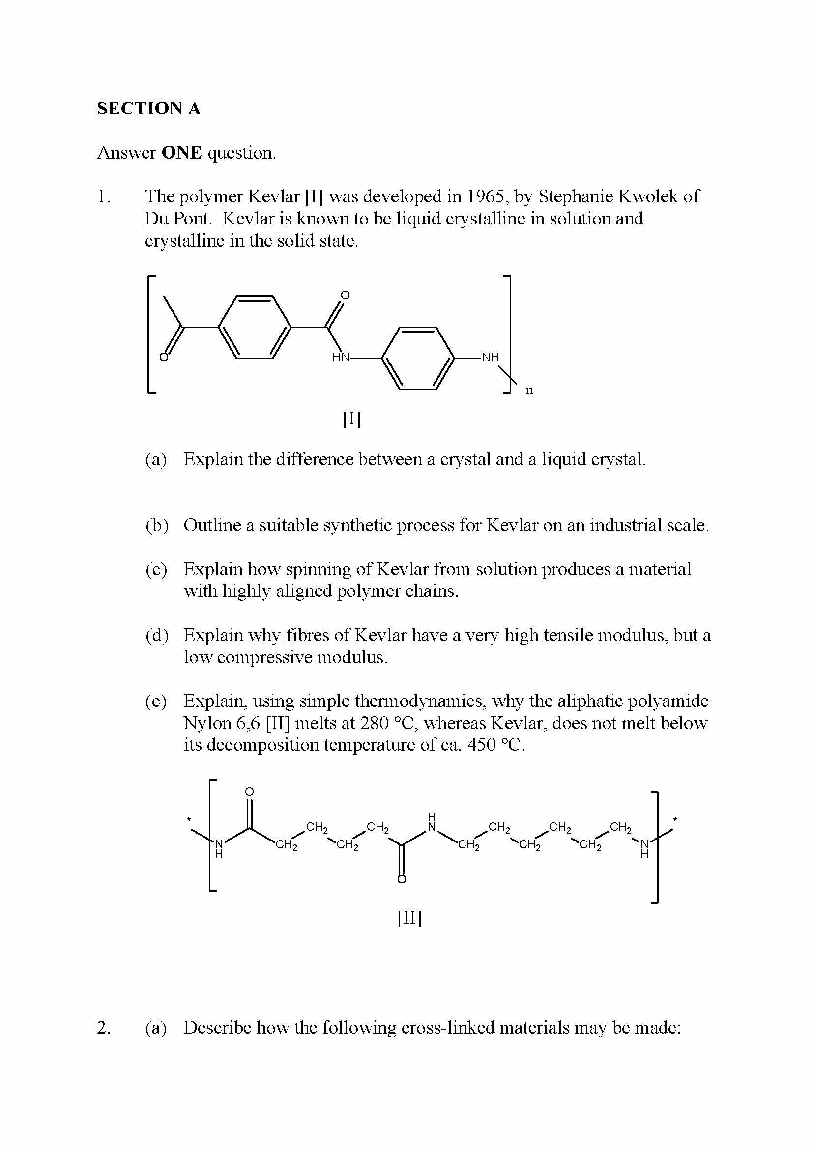 SECTION A Answer ONE question. 1. The polymer Kevlar [I] was dev...