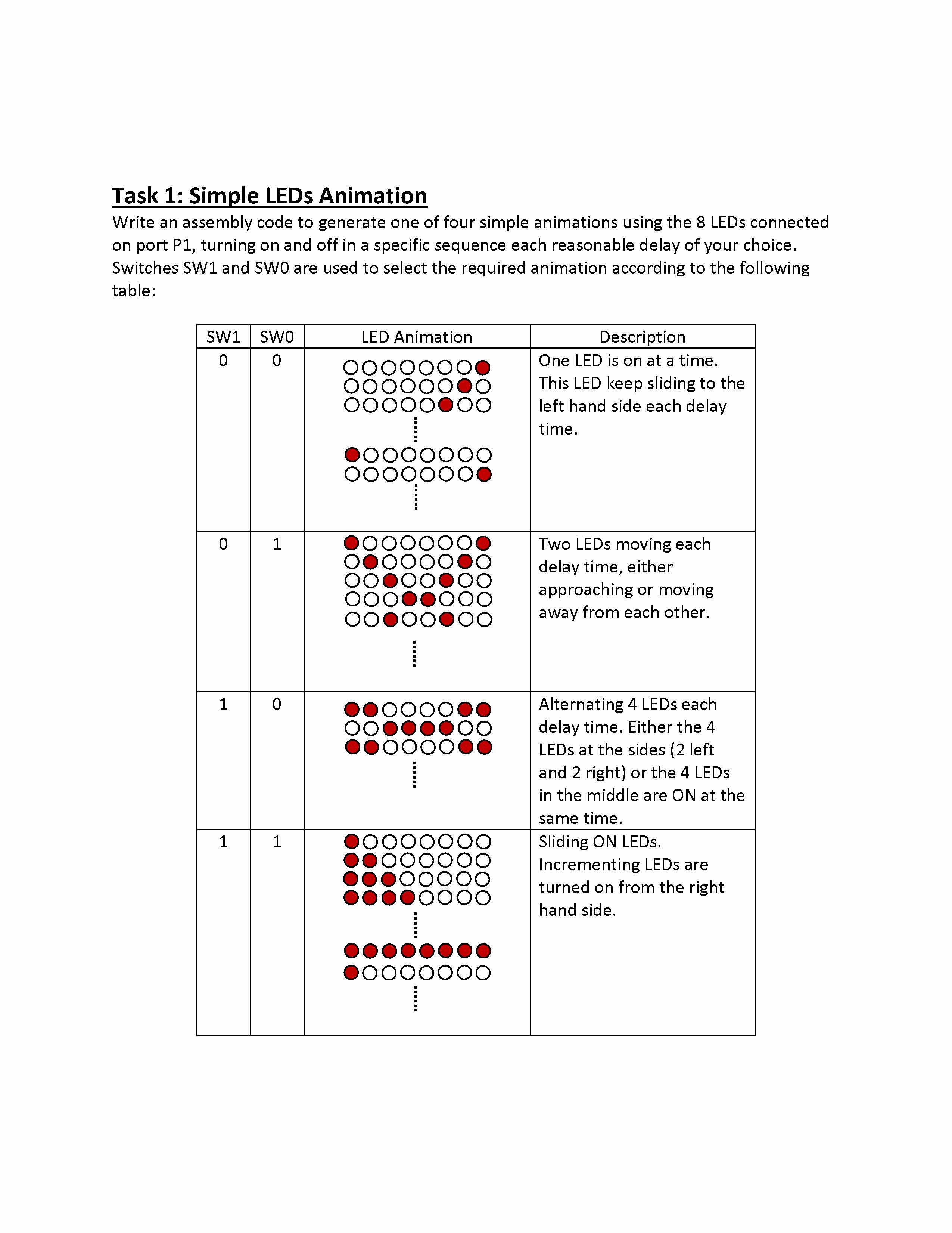 Task 1: Simple LEDs Animation Write an assembly code to generate o...