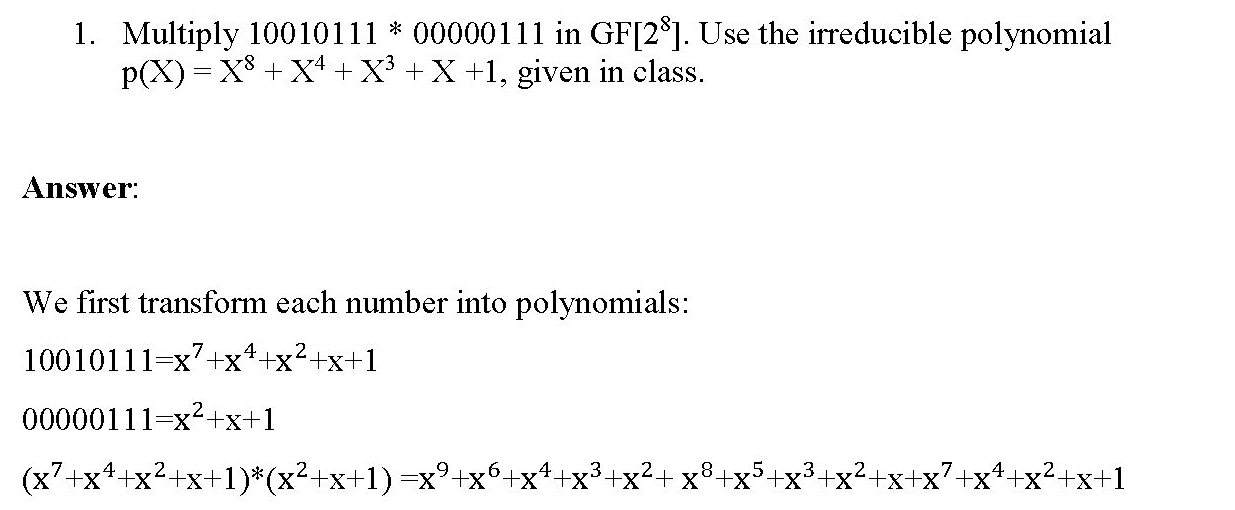1. Multiply 10010111 00000111 in GF[28] Use the irreducible polynom...