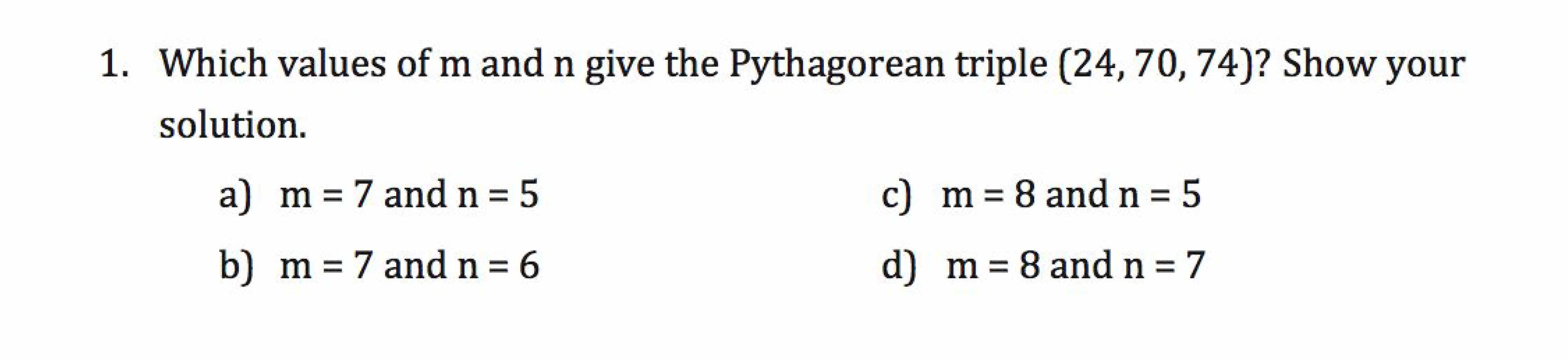 1. Which values of m and n give the Pythagorean triple (24,70, 74)?...