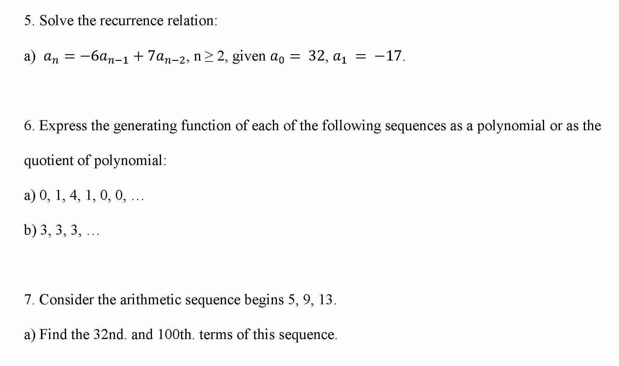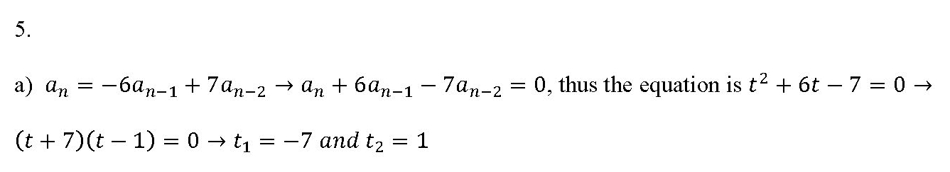 5. Solve the recurrence relation: a) an = -6an-1 + 7an-2, n> 2,...