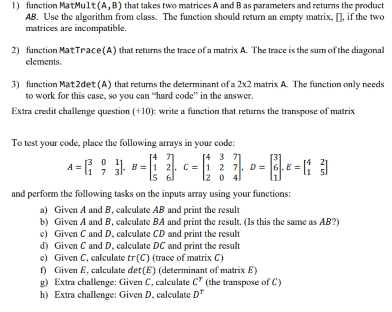1) function MatMult(A,B) that takes two matrices A and B as paramet...