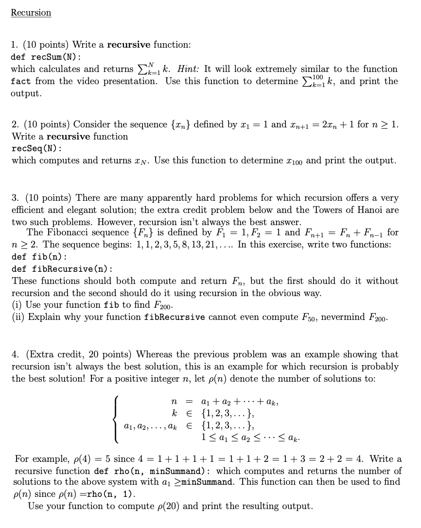 Recursion 1. (10 points) Write a recursive function: def recSum(N...