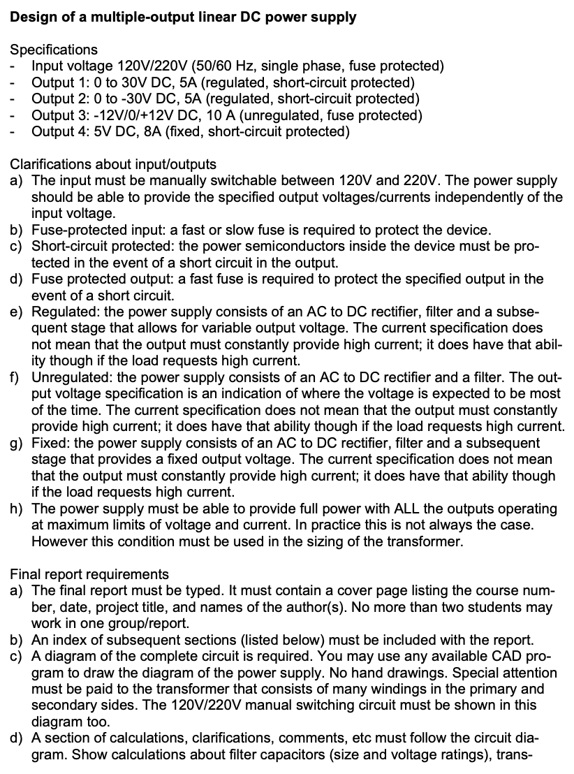 Design of a multiple-output linear DC power supply Specifications ...