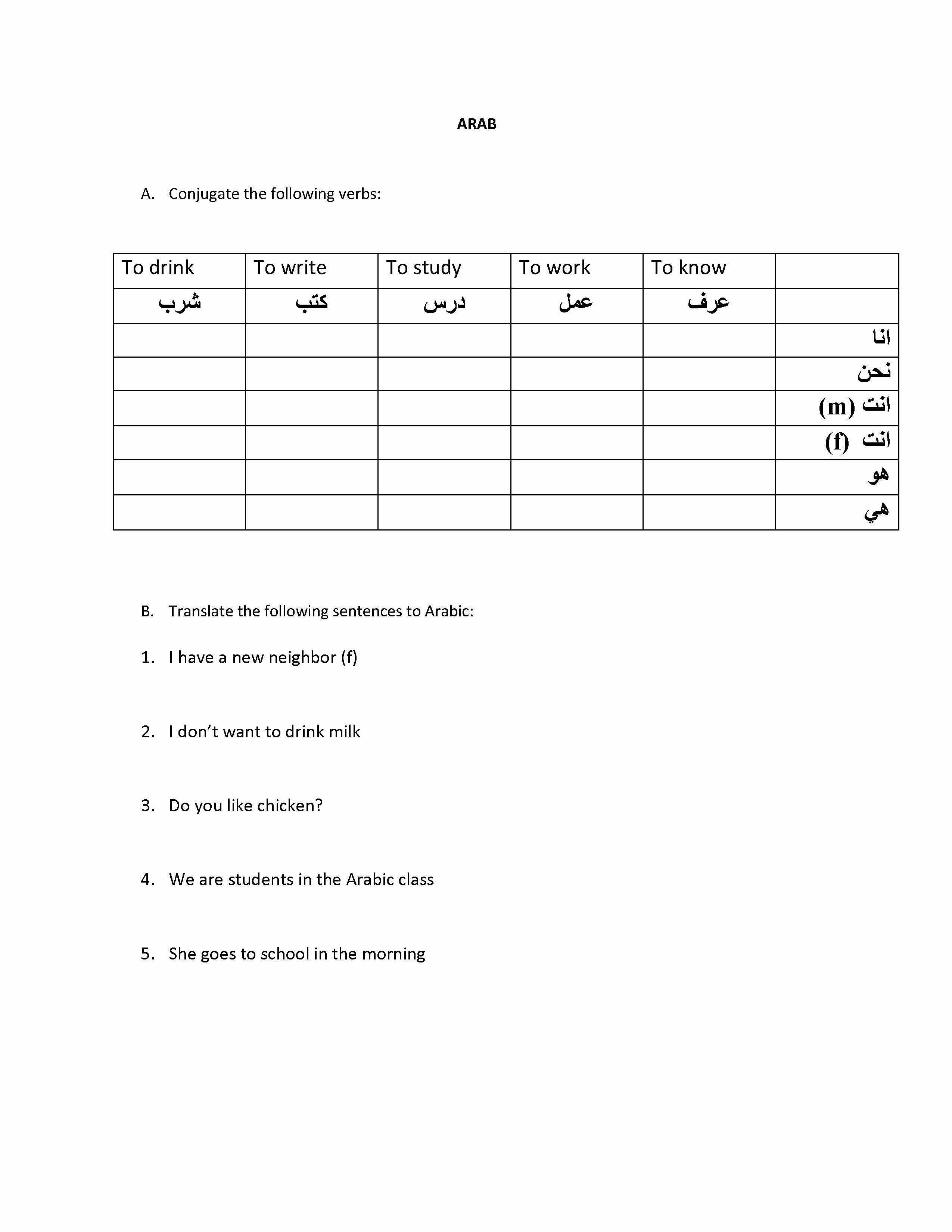 ARAB A. Conjugate the following verbs: To drink To write To study...