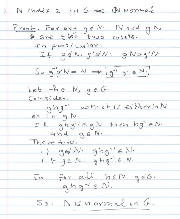 1. If N is a subgroup of index 2 in a group G, then N is normal in ...