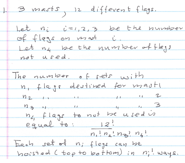 1) A sailing ship has three masts and twelve different signal flags...