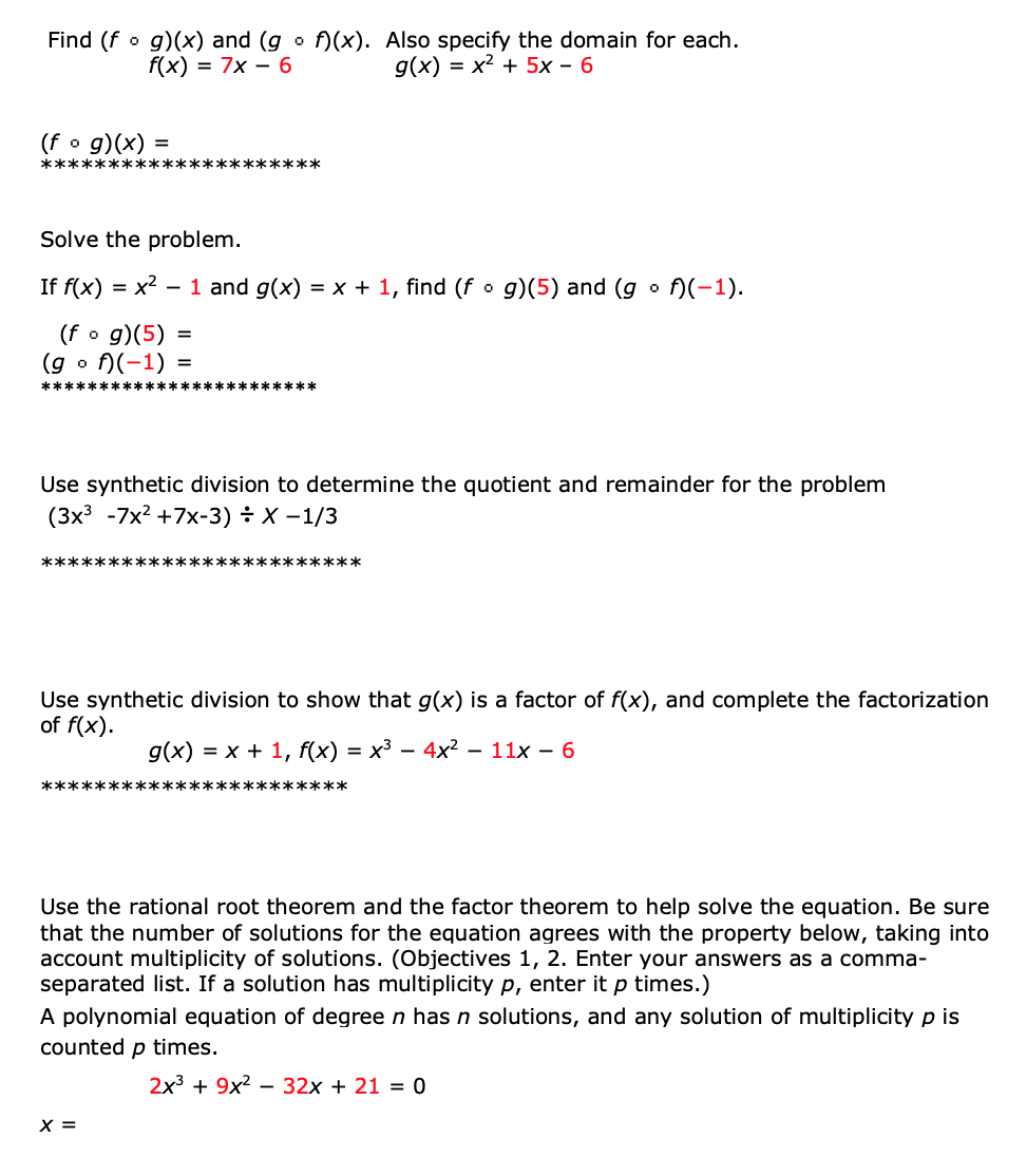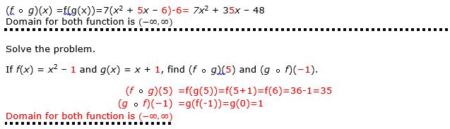 Find (f g)(x) and (g " f)(x). Also specify the domain for eac...