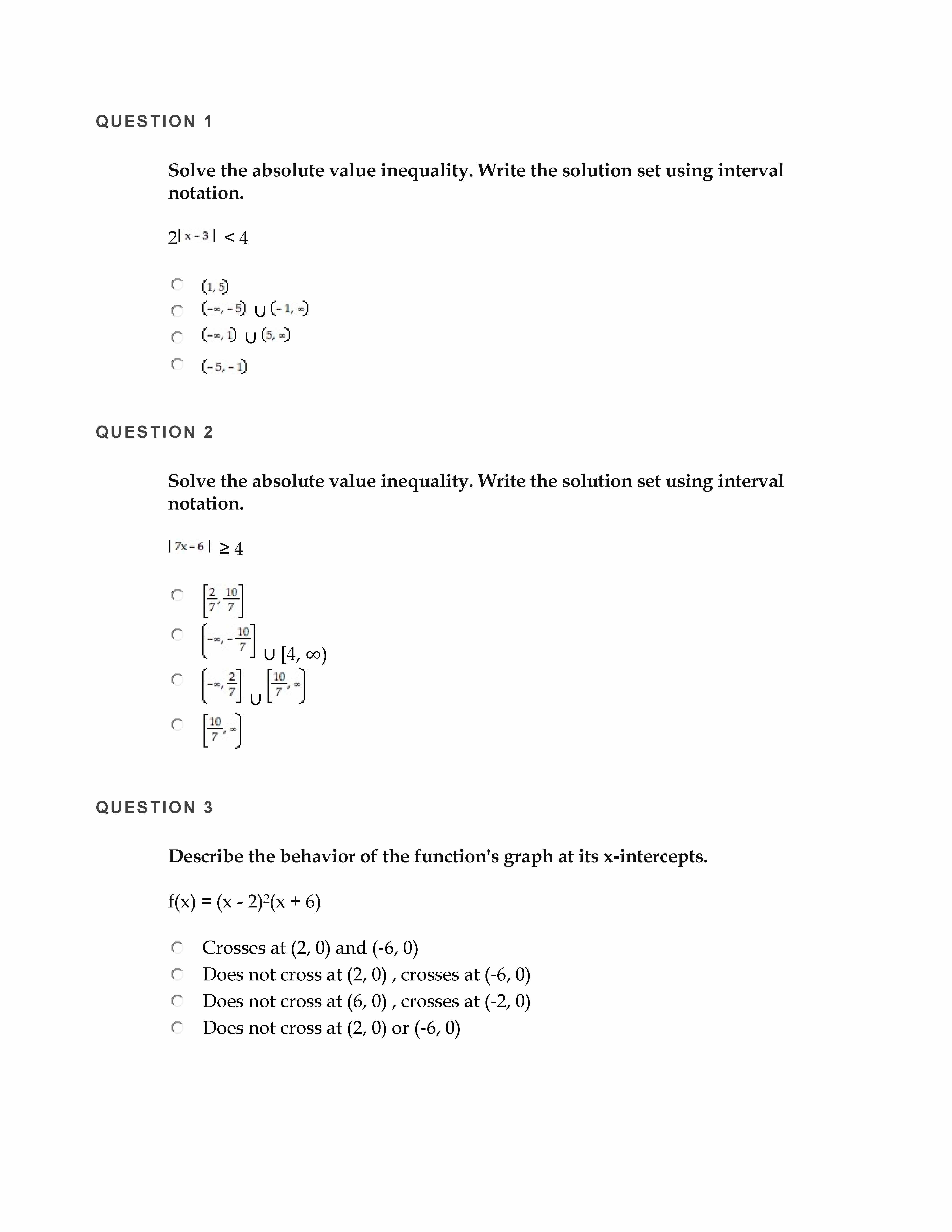 QUESTION 1 Solve the absolute value inequality. Write the solution...