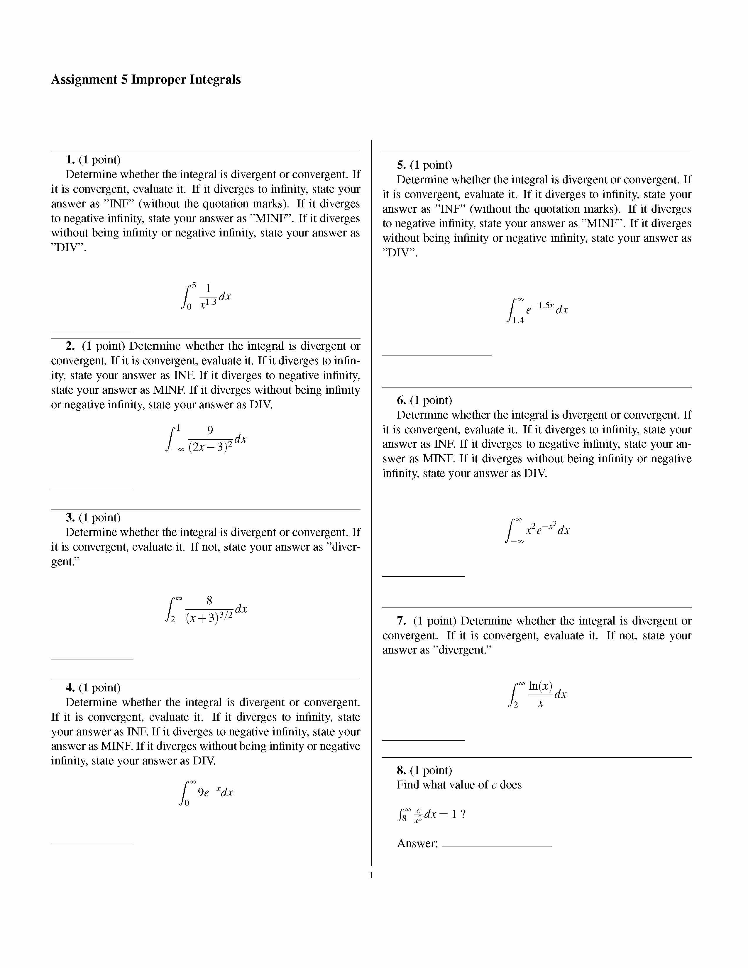 Assignment 5 Improper Integrals 1. (1 point) Determine whether th...
