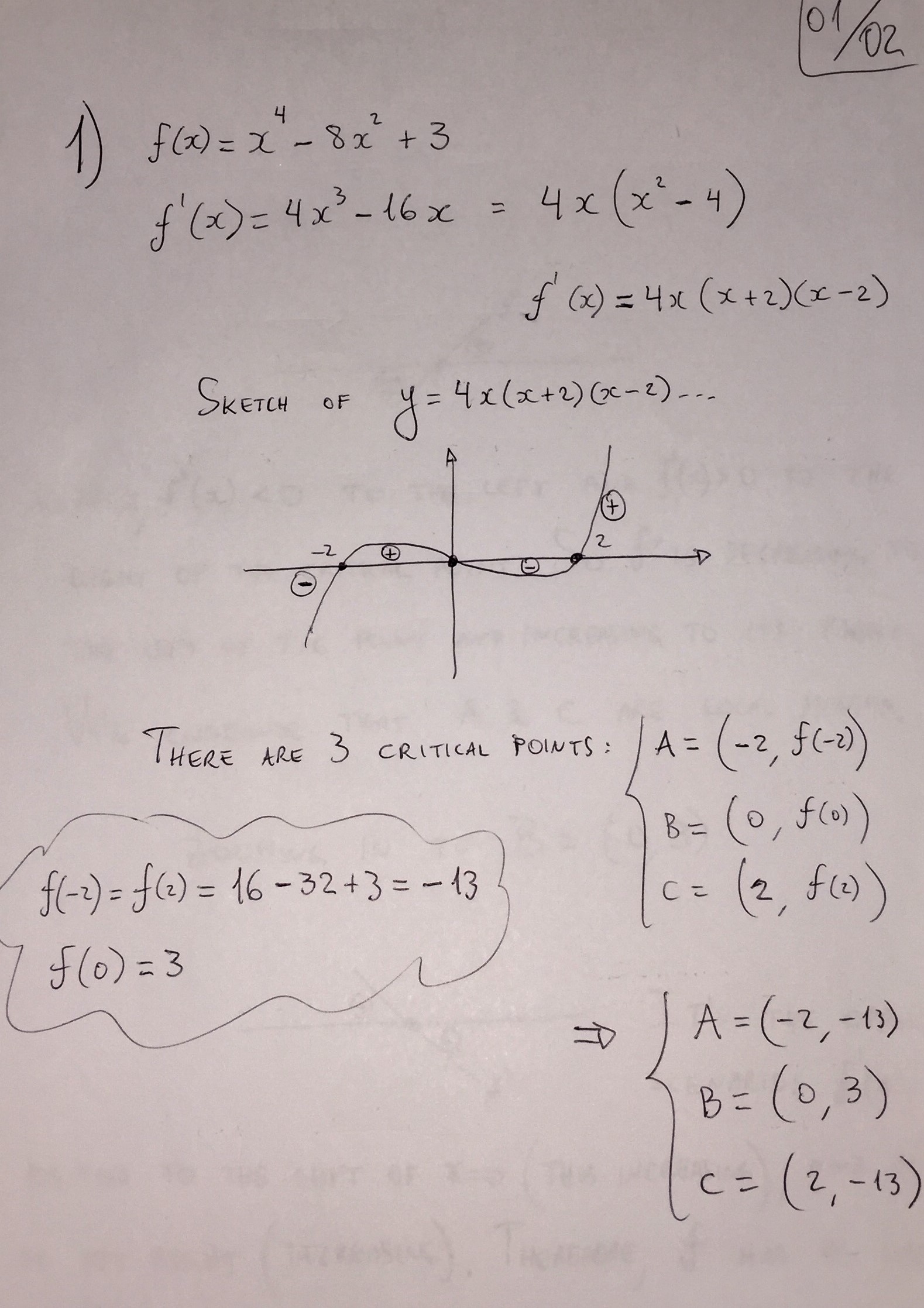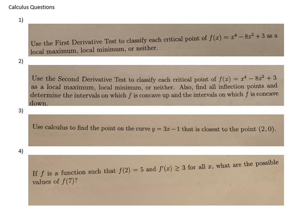 Calculus Questions 1) Use the First Derivative Test to classify e...