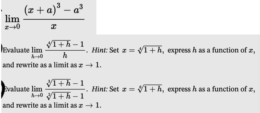 (x +a³ - a³ lim x->0 x 4 1 + h - 1 Evaluate lim . Hint:...