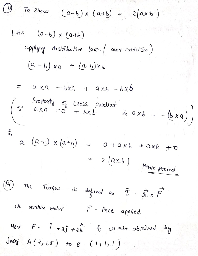 12. Show that(a-b)x(a+b)=2axb = 14. The force F - 7+37+2R acts at...