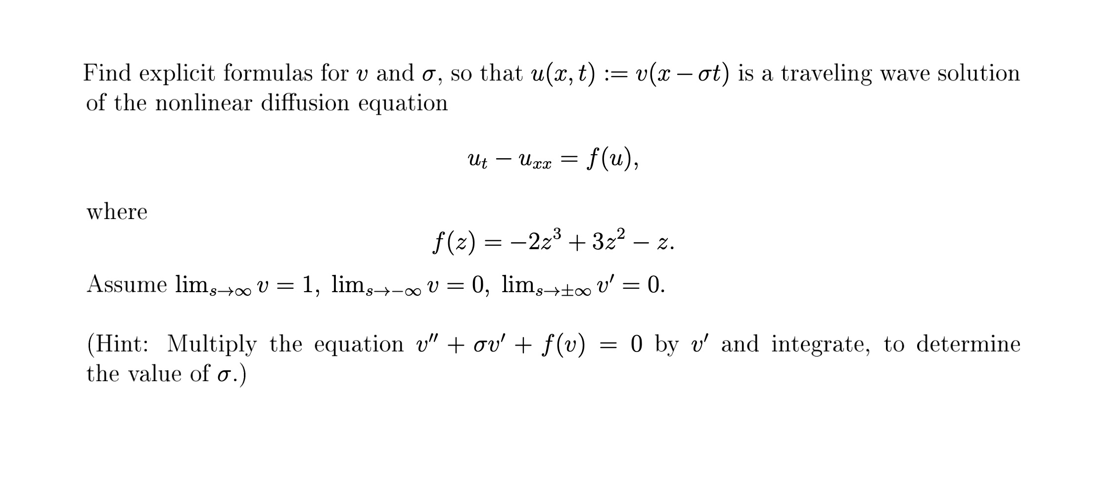 Find explicit formulas for v and σ, so that u(x, t) := v(x−σt)...