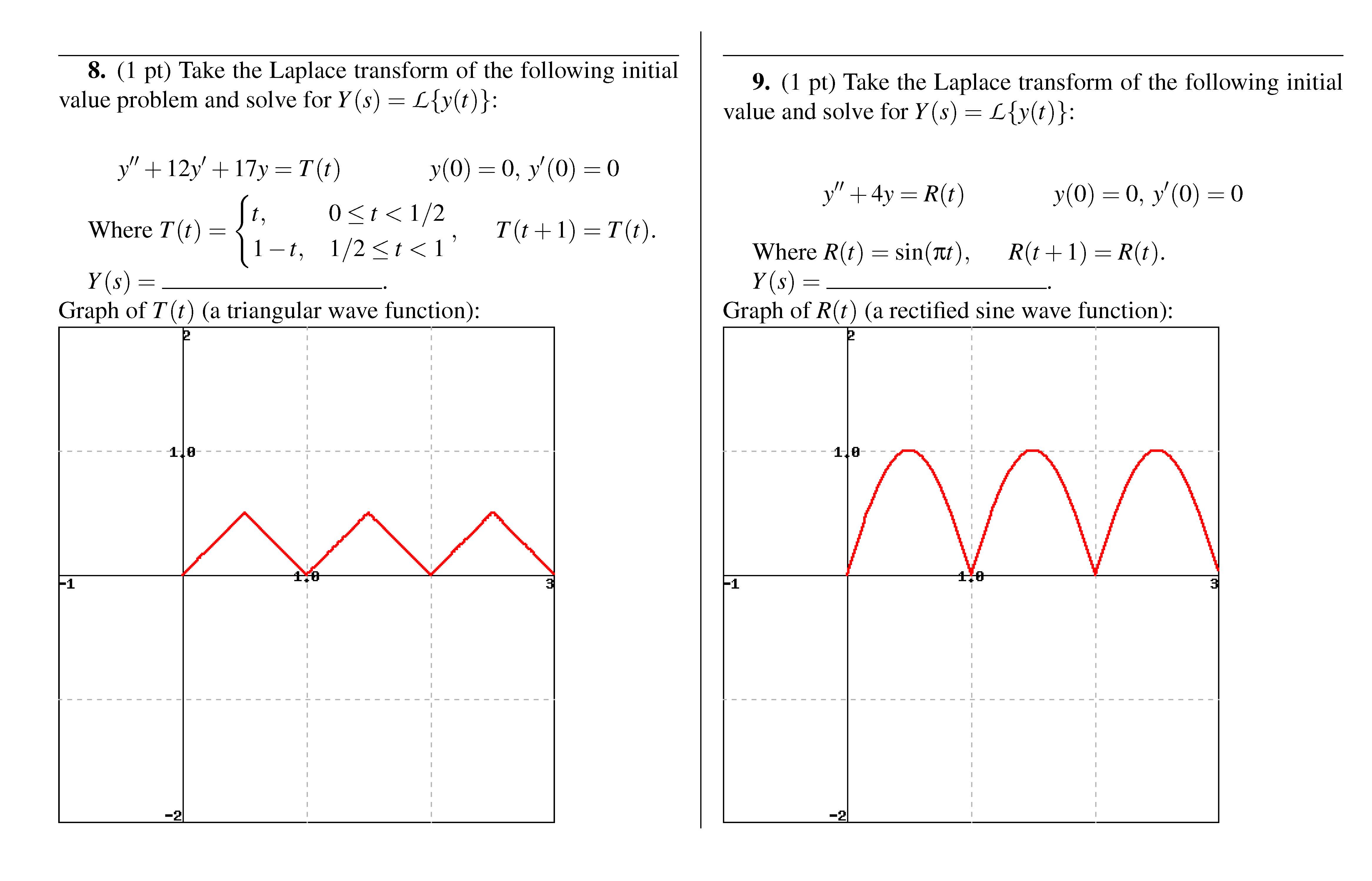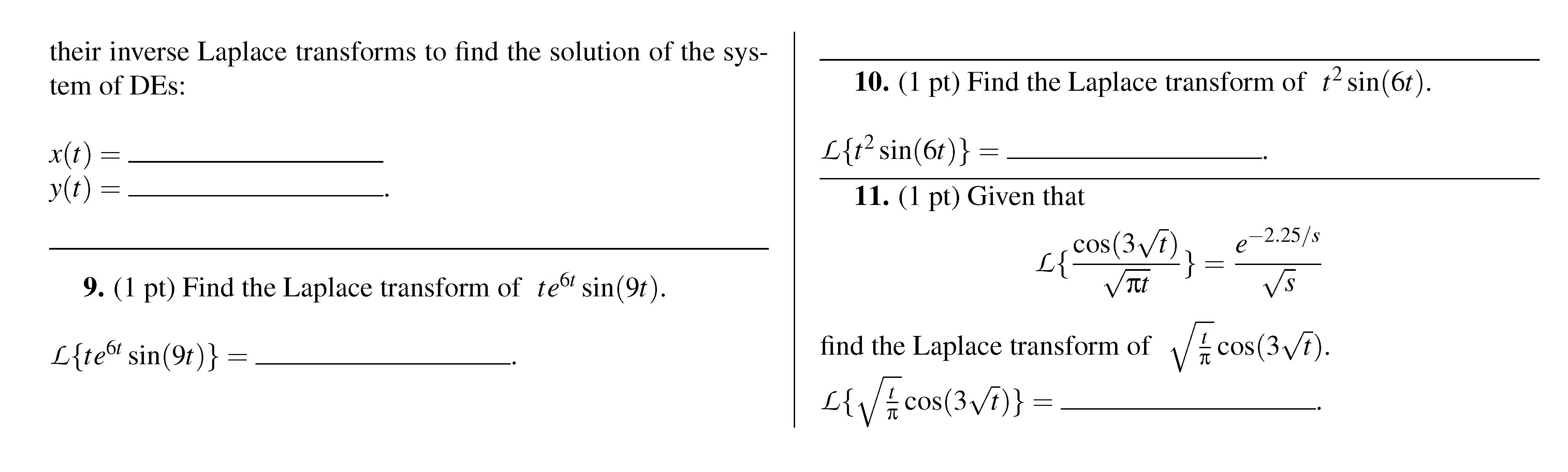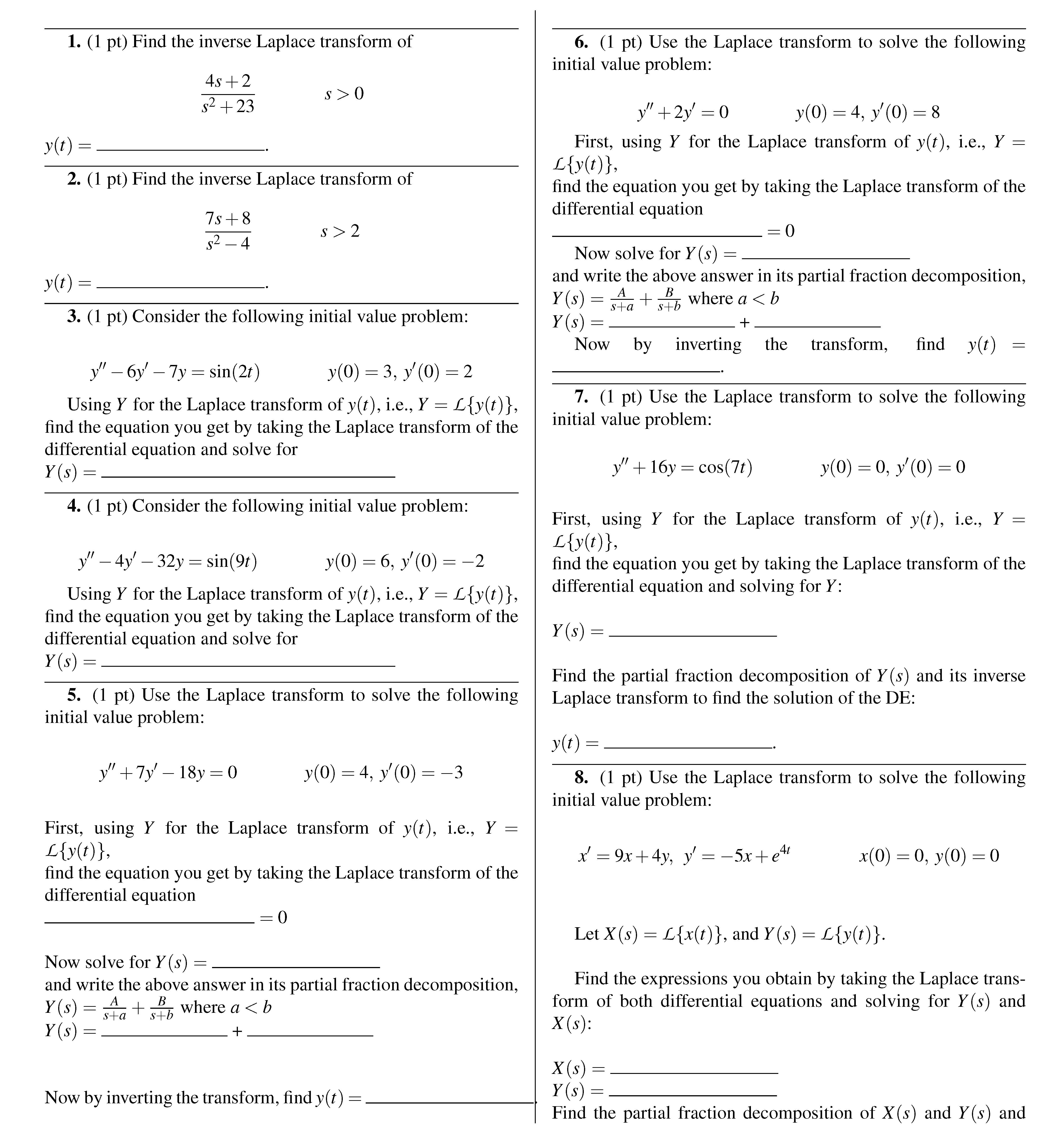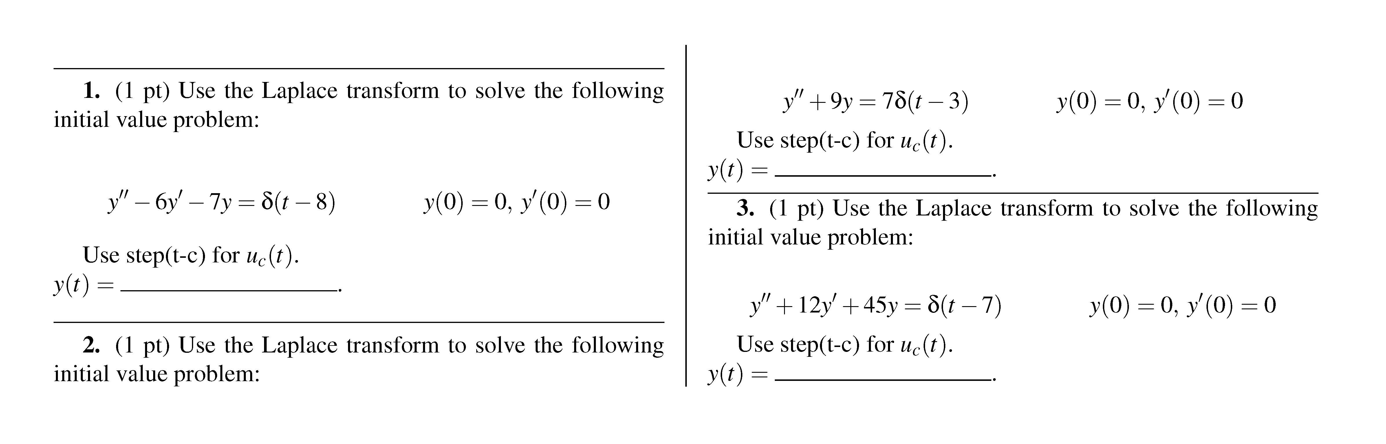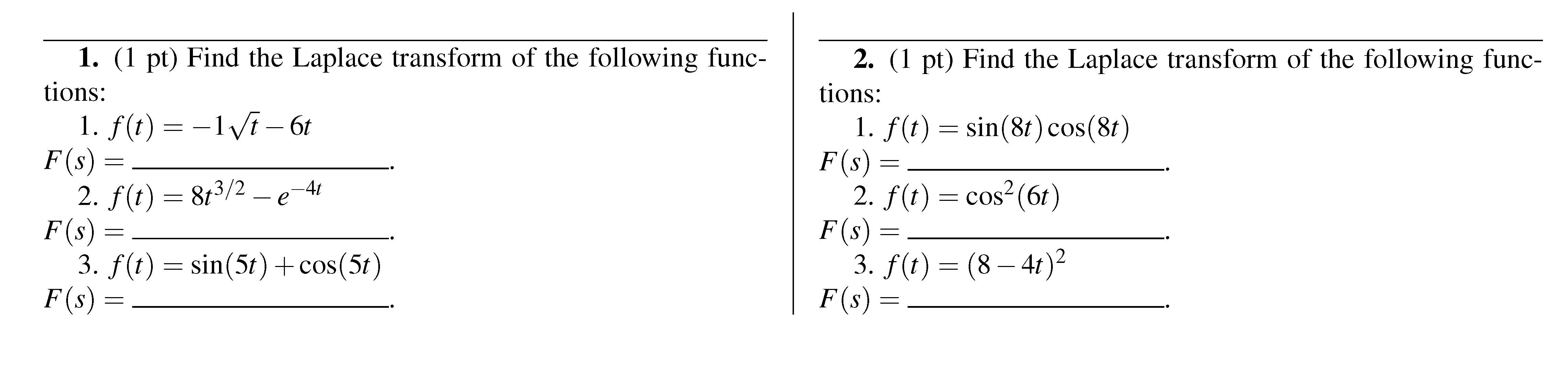 1. (1 pt) Find the Laplace transform of the following functions: 1...