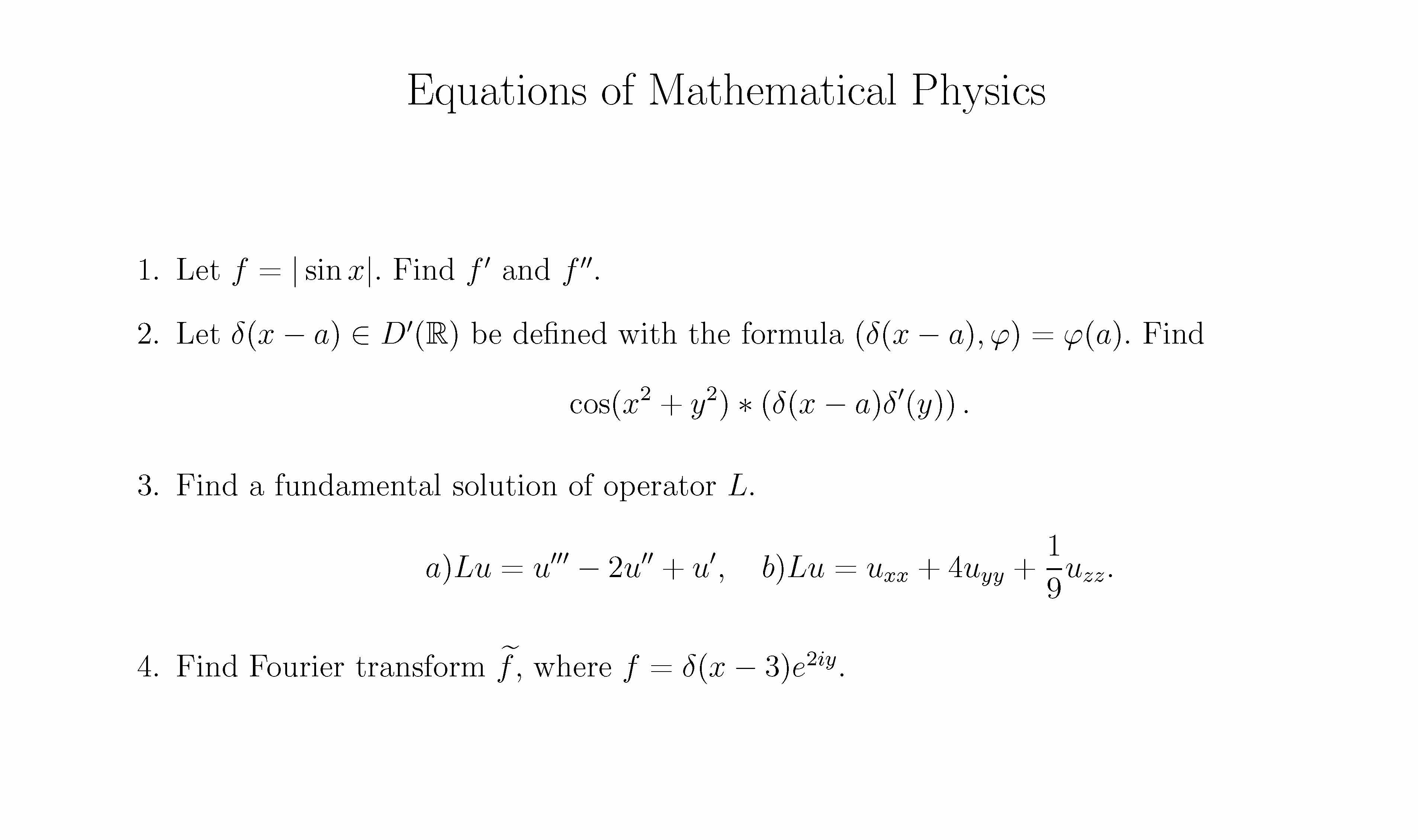 Equations of Mathematical Physics 1. Let f = |sinz|. Find f' and P...