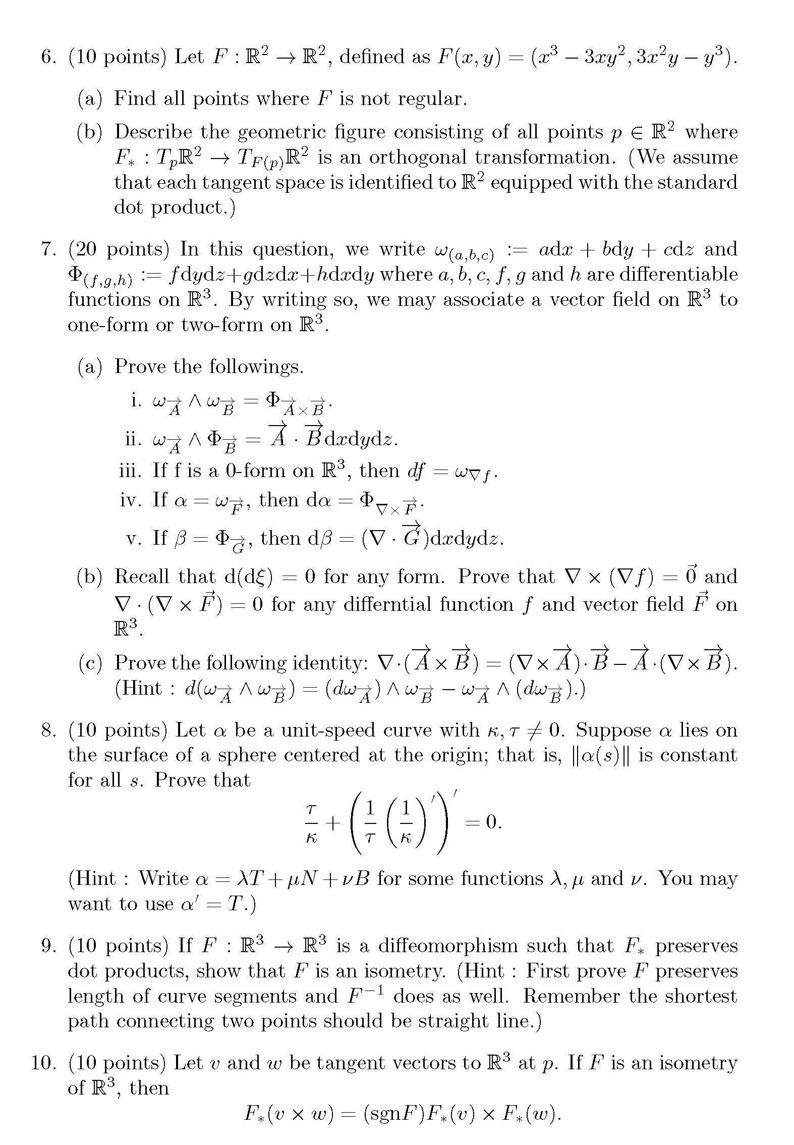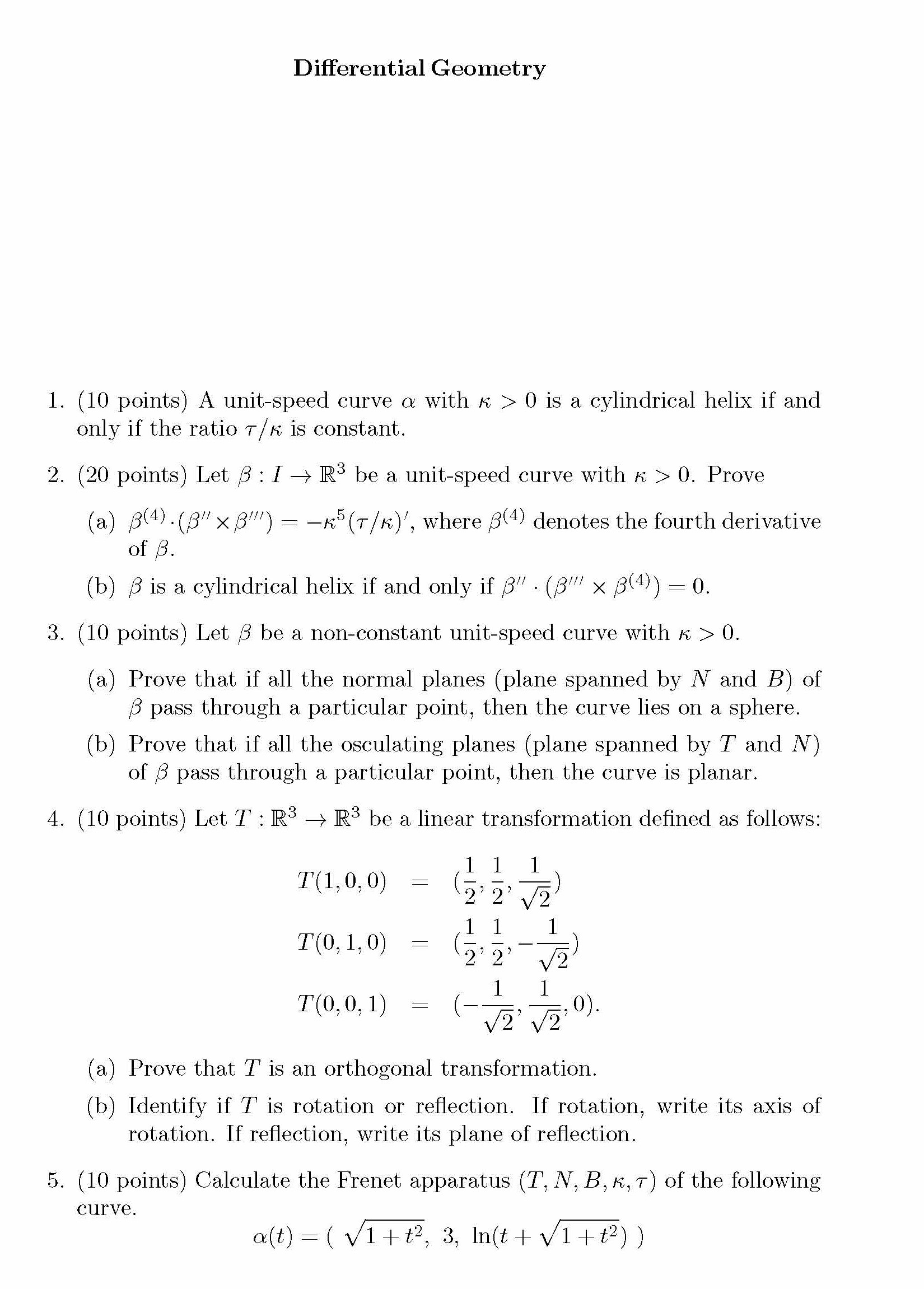 Differential Geometry 1. (10 points) A unit-speed curve α with ...