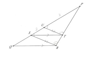 Triangle PQR is given with, ST||QR and UT||SR. If SU = 3 and UP= 8...