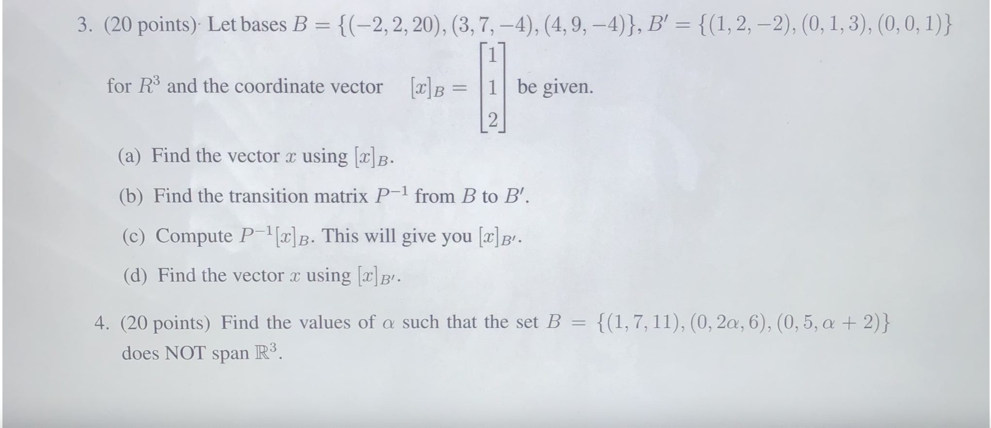 3. (20 points) Let bases B = {(-2,2,20), (3,7,-4),(4,9,-4)},B"...