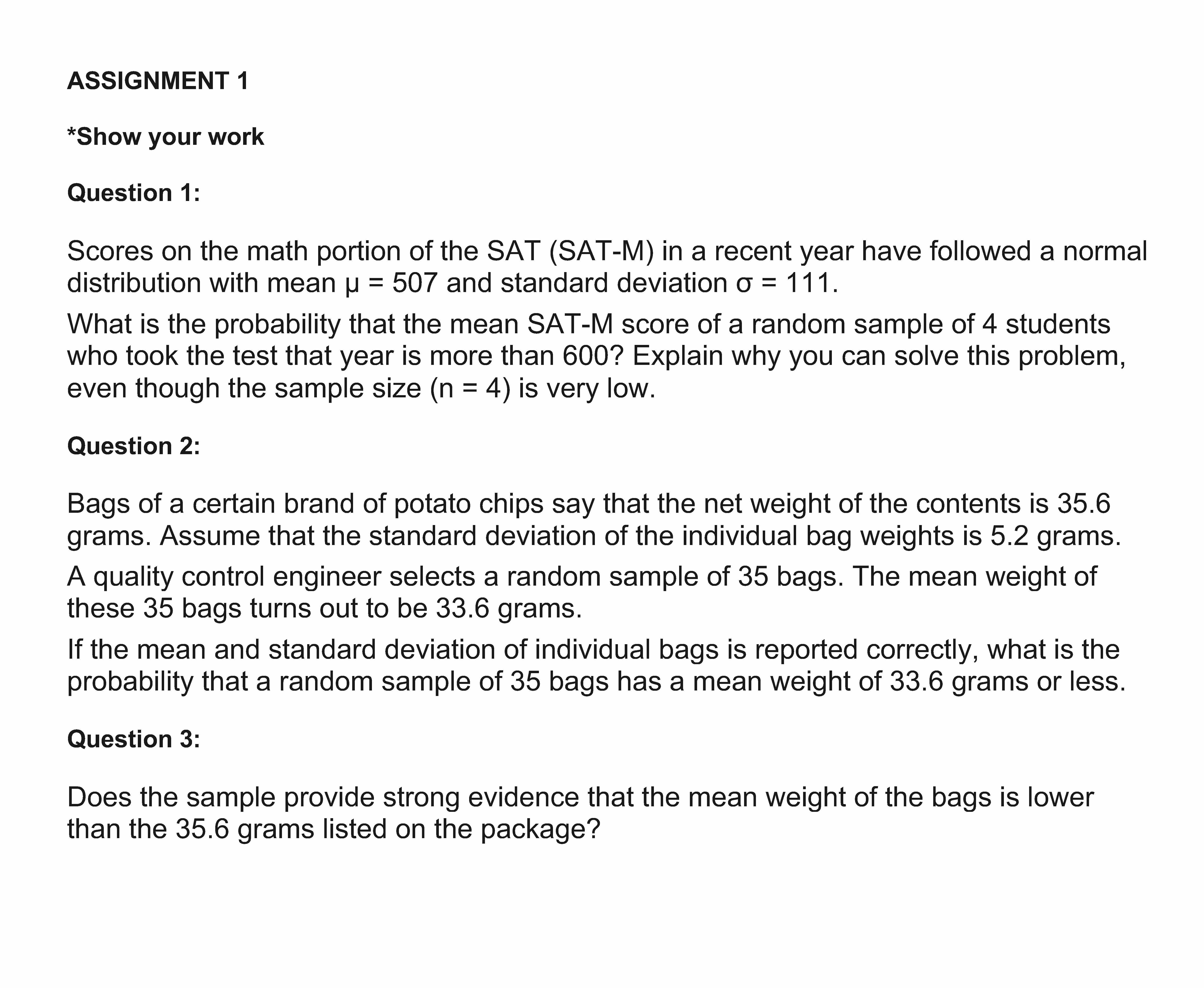 ASSIGNMENT 1 *Show your work Question 1: Scores on the math port...