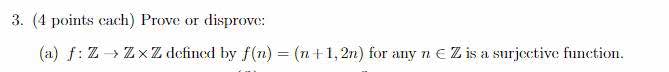 3. (4 points each) Prove or disprove: (a) f : Z Z X Z defined by f...
