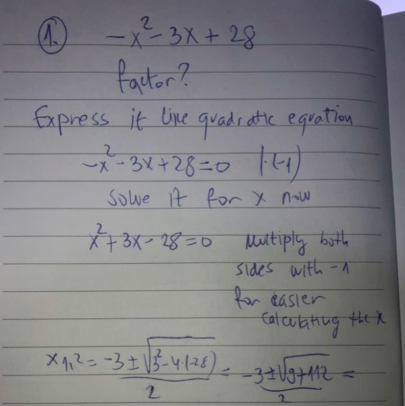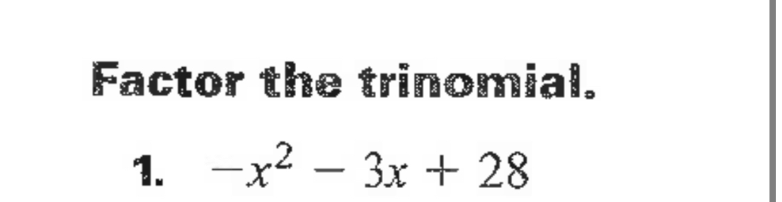 Factor the trinomial. 1. -x² - - 3x+ 28 Solve the equation. 1...