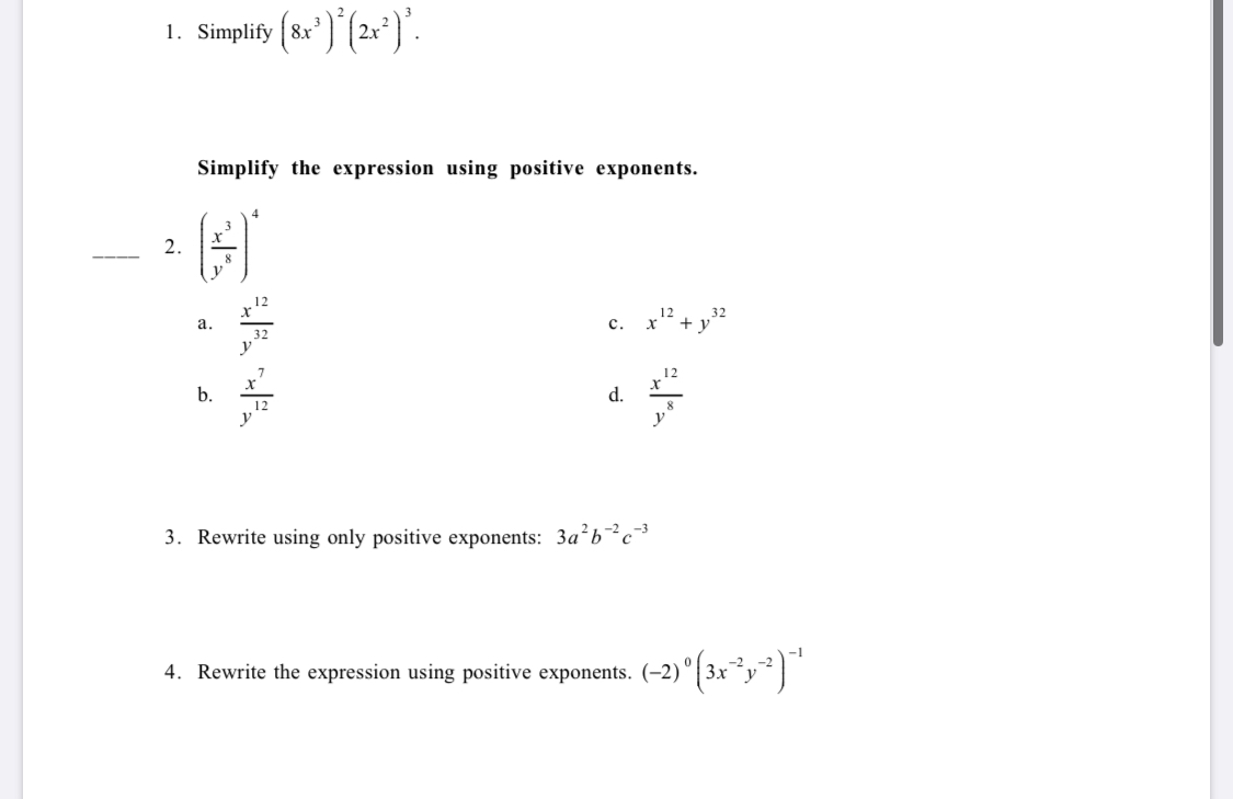 1. Simplify (8x'1'(202) Simplify the expression using positive exp...