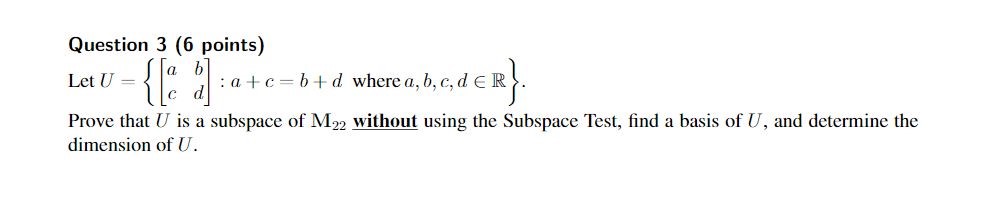 Question 3 (6 points) Let U = { a a b C : a + c = b + d wher...
