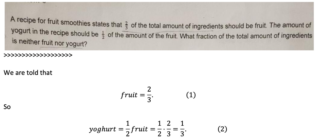 A recipe for fruit smoothies states that 2/3 of the total amount of...