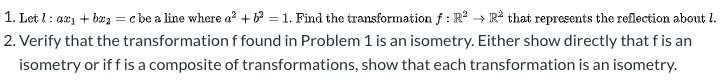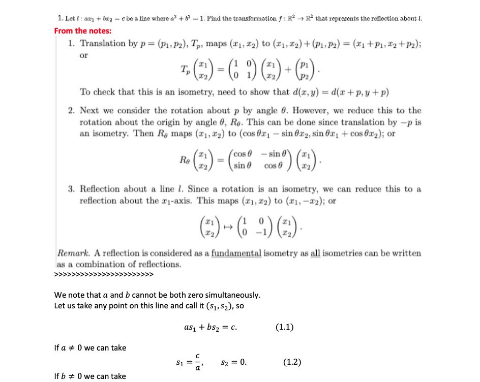 1. Let I : a21 + b22 = c be a line where a2 +62 = 1. Find the trans...