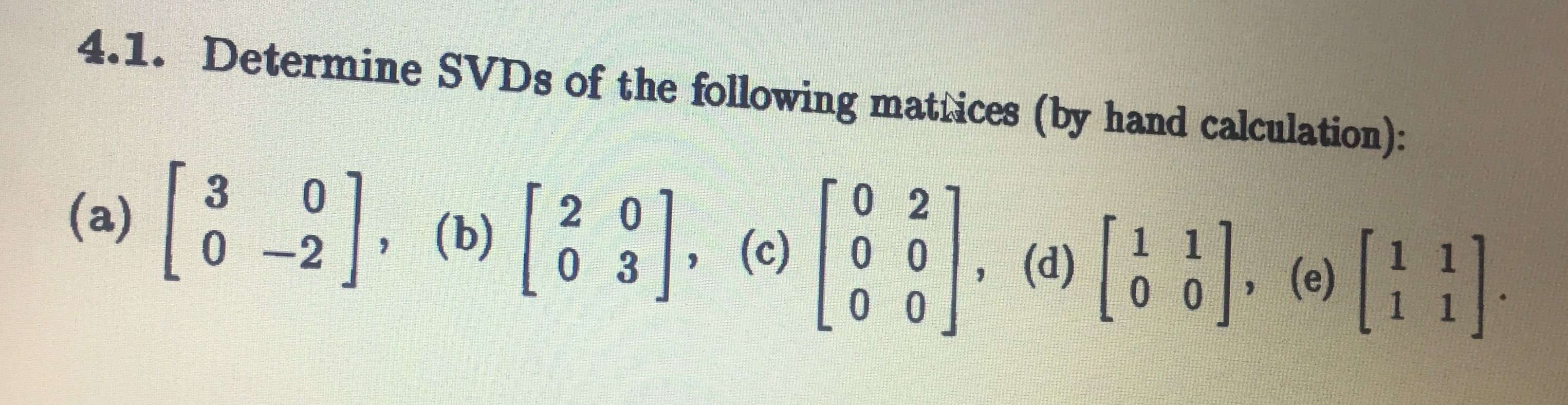 4.1 Determine SVDs of the following matrices (by hand calculation) ...