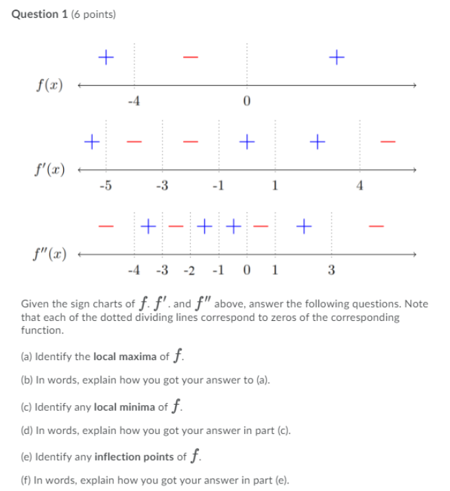 Question 1 (6 points) + - + f(x) -4 + - - + + - f'(x) ...