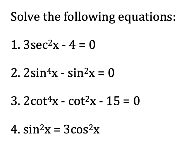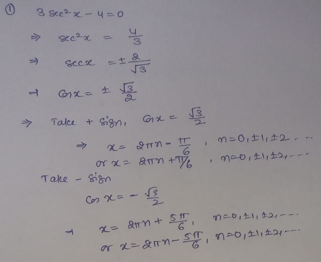 Solve the following equations: 1. 3sec2x - 4 = 0 2. 2sin4x - sin2...