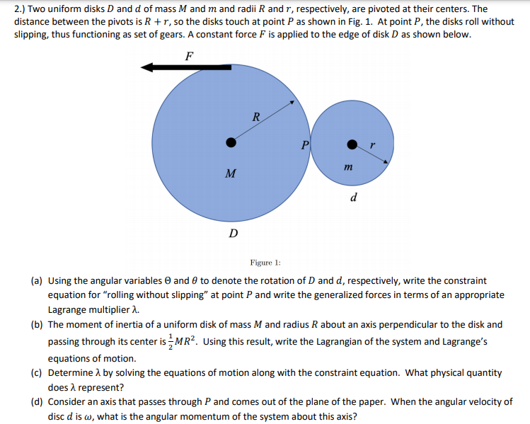 2.) Two uniform disks D and d of mass M and m and radii R and r, re...