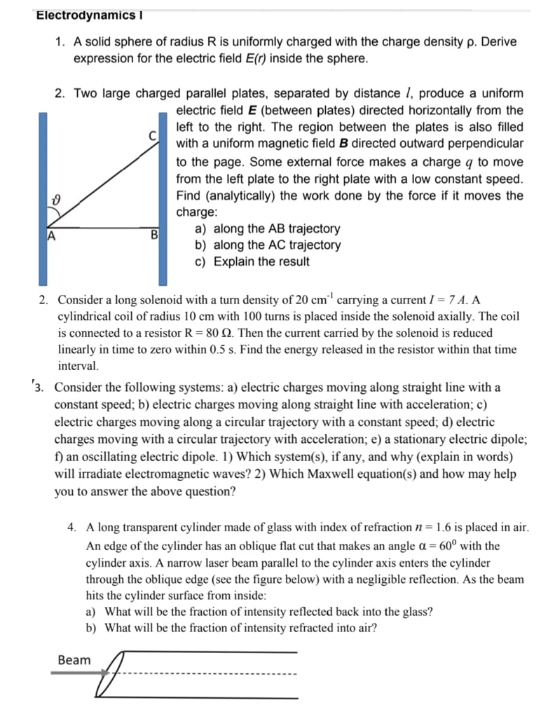 Electrodynamics I 1. A solid sphere of radius R is uniformly charg...