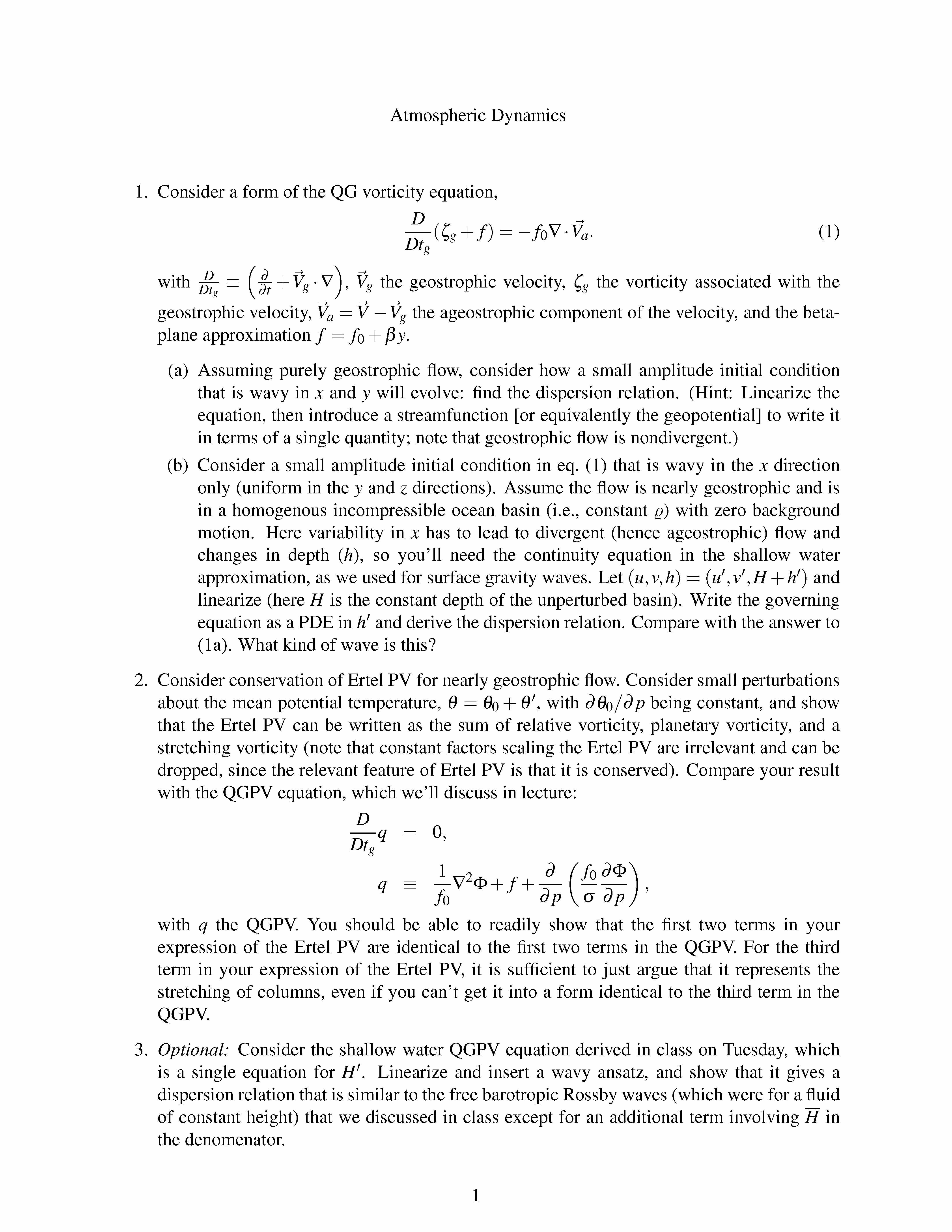 Atmospheric Dynamics 1. Consider a form of the QG vorticity equati...