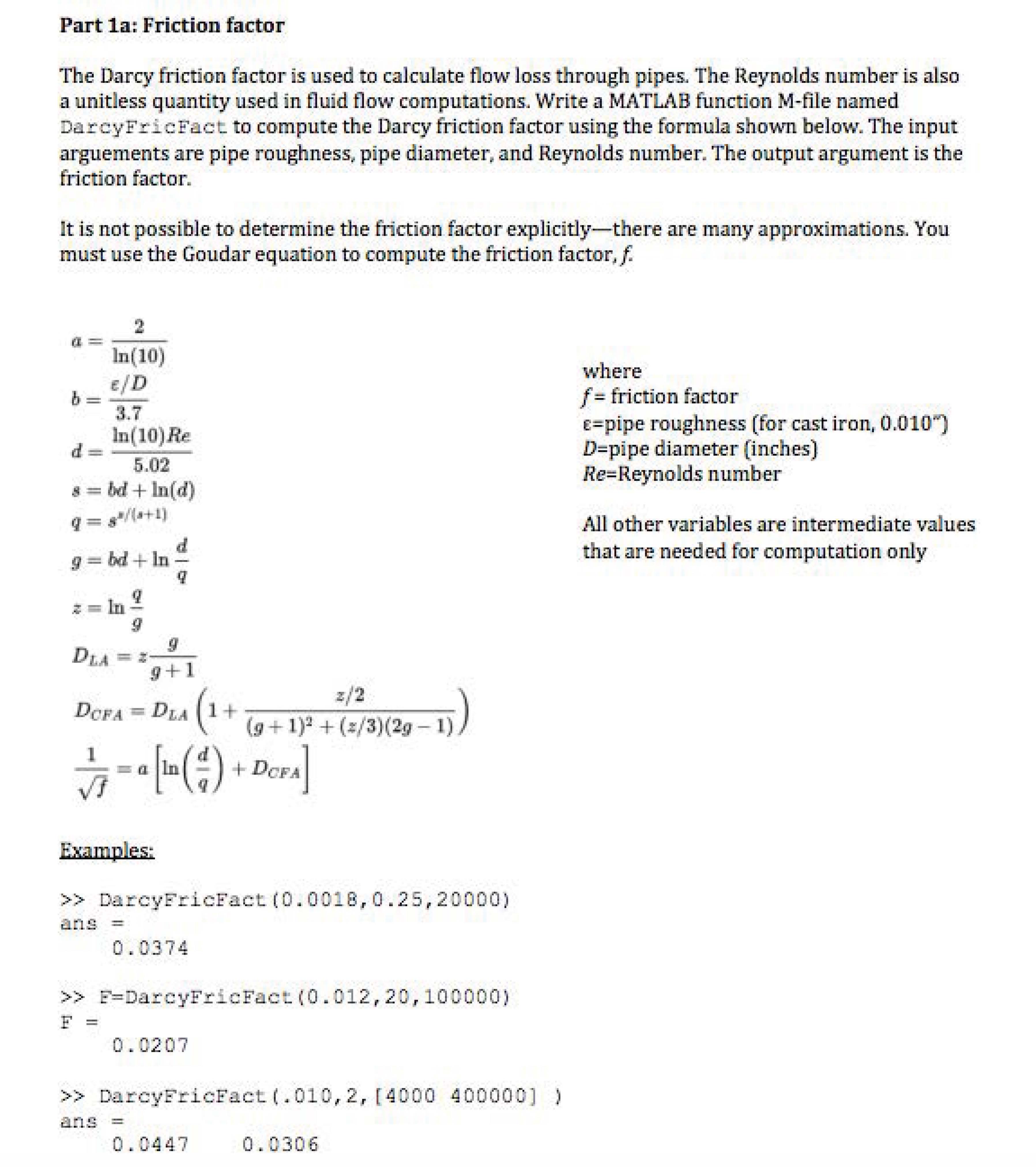 Part 1a: Friction factor The Darcy friction factor is used to calc...