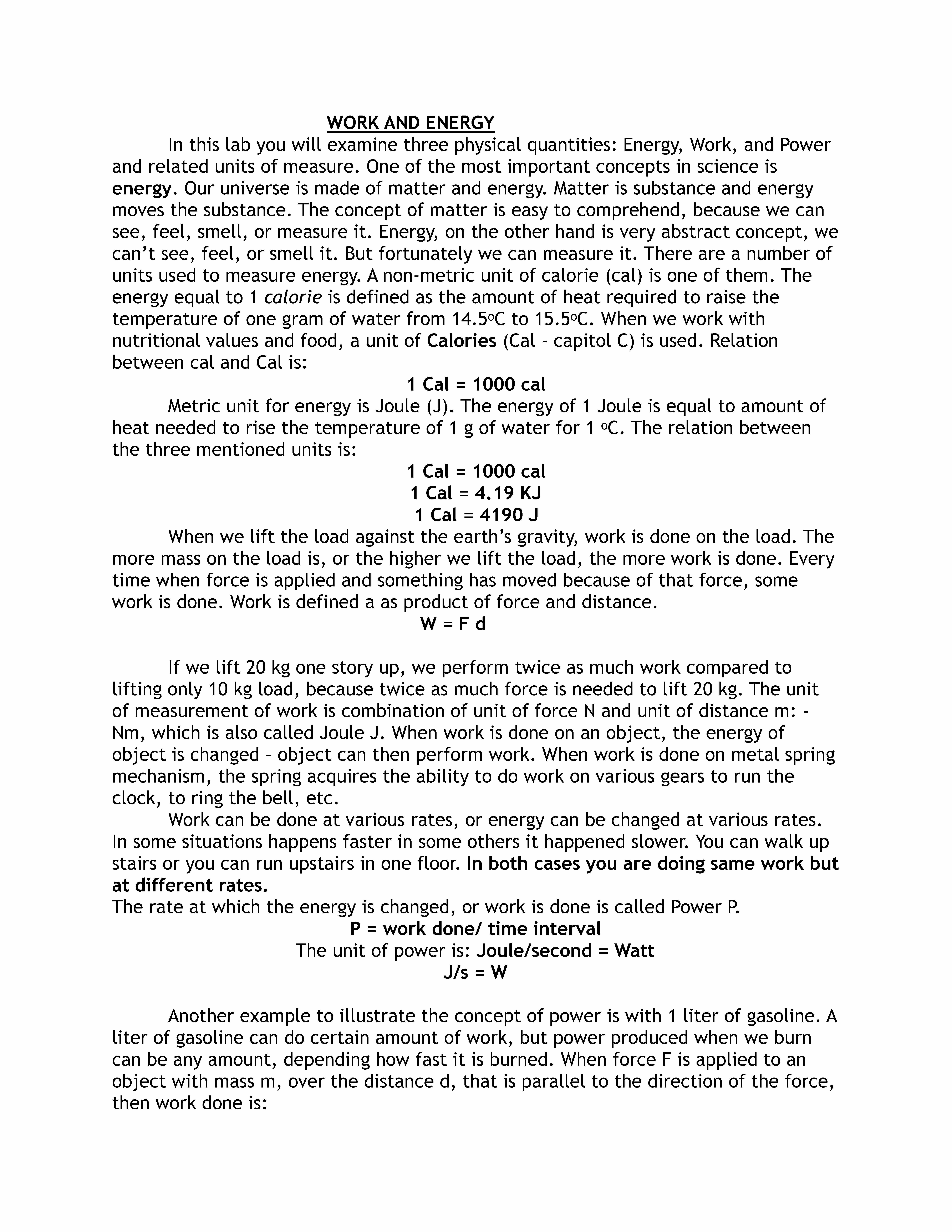 WORK AND ENERGY In this lab you will examine three physical quanti...