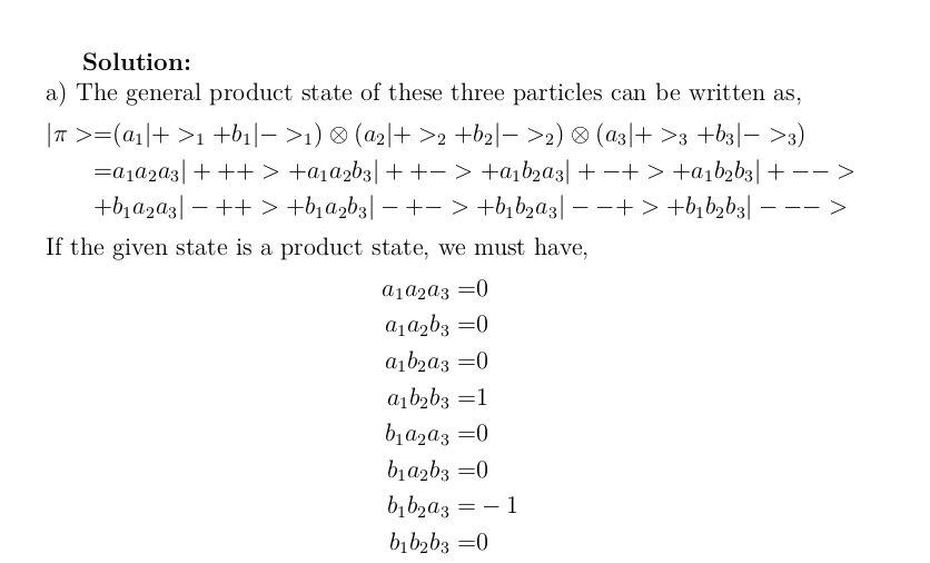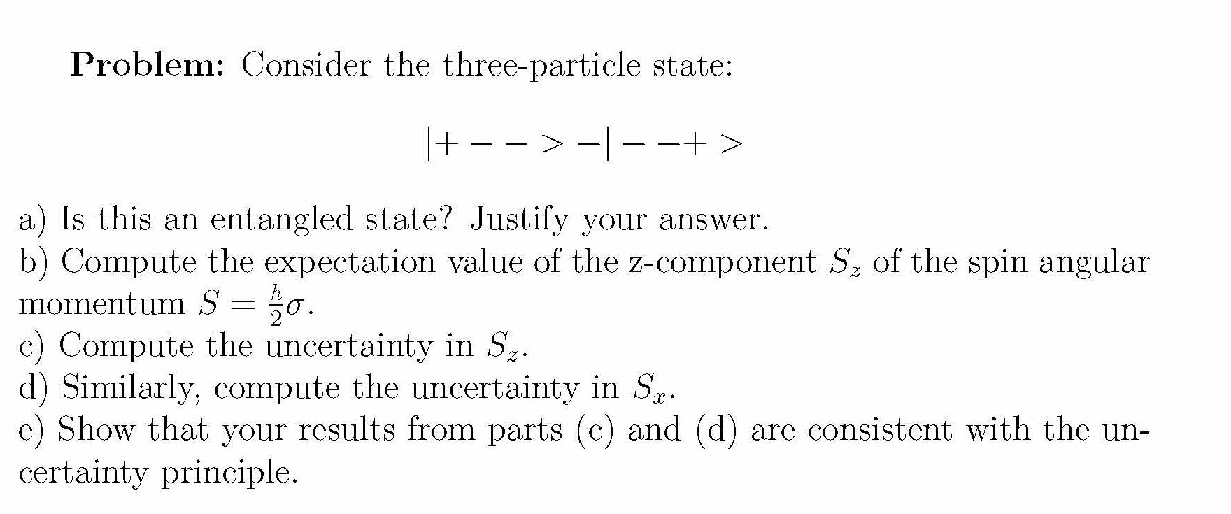 Problem: Consider the three-particle state: |+ − − >...
